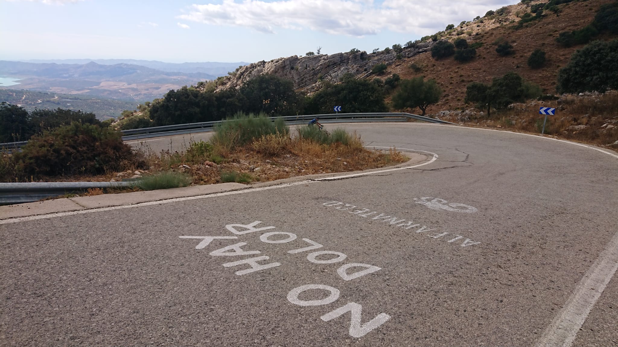 Warm up: Von Alcaucín aus stürzen wir uns zunächst hinunter in Richtung Viñuela, um dann allmählich ansteigend auf der A356 dem Südwestufer des Viñuela-Stausees zu folgen. Unmittelbar vor Ríogordo ("dicker Fluss") zweigen wir dann auf die A7204 nach Norden ab. Die Landschaft wechselt ganz allmählich von grün auf karg . Hinter Mondrón haben wir dann die erste Serpentinenorgie der Tour aufgetischt: Der Puerto del Sol ist zunächst etwas steiler, dann wieder moderater. Herrliche Tiefblicke. Legendär die allmählich verblassende Inschrift auf dem Asphalt fast ganz oben: "No hay dolor" :-) Ab jetzt geht es im Wesentlichen bergab. Wir passieren Periana und rollen weiter bis kurz vor Viñuela. Stilvoll beenden wir den Auftakt mit der Bergankunft in Alcaucín.